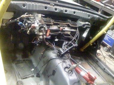 Als Nächstes wurde das Armaturenbrett entfernt, damit der Käfig sich besser einbauen ließ. Wenn man die ganzen versteckten Schrauben und Kniffe kennt, ist diese Aufgabe innerhalb von einer Stunde zu meistern! Nach dem das Armaturenbrett raus war, haben wir alle überflüssigen Kabel vom Kabelbaum entfernt. Hierbei ist drauf zu achten das keine notwendigen Kabel entfernt werden, die man später noch gebrauchen könnte!