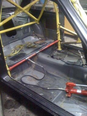 Nun folgte einer der der aufwändigsten Arbeitsschritte an dem Rennwagen. Der Überrollkäfig ist so gebaut dass er sehr eng an der Karosserie anliegt und nur auf sehr komplizierten Weg ins Auto rein zu bekommen ist. Als er dann einmal im Auto drin war hieß es alles ausrichten, Löscher bohren, Platten schweißen etc., also kurz gesagt viel Arbeit. Um die Streben an der B-Säule auf die richtige Position zu bekommen, mussten wir eine Hydraulikpresse benutzen.