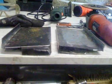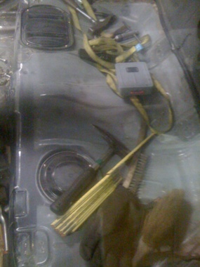 Nun gingen wir das Schiebedach an, was uns fast zum verzweifeln gebracht hätte. Da es einfach nicht raus wollte. Als Erstes wurde das Schiebedach an sich entfernt. Was nun übrig blieb war die Dachkassette. Die war am Dach verklebt und verschweißt. An beiden Seiten war, wie auf dem ersten Bild zu erkennen, sie an der Mitte an gepunktet. Die Schweißpunkte kann man mit einem Bohrer entfernen. Zudem war die Kassette auch auf der Vorder- und Rückseite angepunktet, siehe zweites Bild. Nach diesem Schritt entfernten wir noch die Klebereste mit einem Teppichmesser und stellten die Kontur des Daches wieder mit einen Hammer und Holzkeil her.
