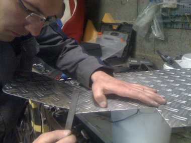 Die hinteren Aussparungen der Seitenwand haben wir mit Forex Plastikmatten abgedeckt. Diese bekommt man in jedem Baumarkt. Zu vor wurden die Rechteckigen Platten an die Aussparung angepasst und letztendlich an die Karosse vernietet.