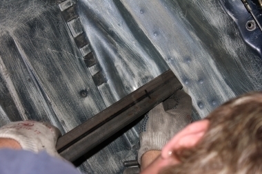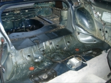 Da ich zu dieser Zeit das Auto brauchte, um auf die Arbeit zu fahren, hieß es erst mal: Alles ausbauen was sich hinter den Vordersitzen befindet. Dazu mussten die Rücksitzbank, das Ersatzrad, der Teppich und die Türverkleidungen raus. Im nächsten Schritt mussten die Teermattenen abgekratzt werden. Ich glaube jeder, der schon mal die Matten aus dem Auto raus gemacht hat, wird mir zustimmen, dass das eine „bescheidende“ Arbeit ist. Die Teermatten haben wir mit einem Heißluftföhn und Spachtel heraus gekratzt!! Dafür haben wir ca. 2 Stunden gebraucht (meiner Meinung nach relativ zügig!!).