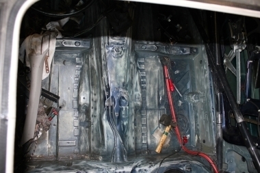 An dem darauf folgenden Wochenende wurde der Rest rausgerissen. Die Vordersitze, Mittelkonsole, Teppich und Amaturenverkleidung. Das hieß nochmal Teermattenen rauskratzen und den ganzen Innenraum schleifen, da ich Ihn im späteren Verlauf noch lackieren wollte. Mit Verdünnung haben wir die Klebereste der Teermattenen entfernt, wobei man einige Tücher