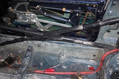 Der Einbau des Käfigs hat sich als nervenraubend erwiesen, da man wegen der lackierten Sachen sehr vorsichtig arbeiten musste. Zudem war es sehr schwierig, den Käfig an die vorher vorbereiteten Stellen zu bekommen. Dies konnte nur mit viel Geduld und Zeit geschafft werden. Passend zum Käfig, habe ich auch die hintere Domstrebe eingebaut. Damit die überlackierten Kabel wieder in einem neuen Glanz erstrahlen, habe ich sie mit schwarzem Klebeband umwickelt.