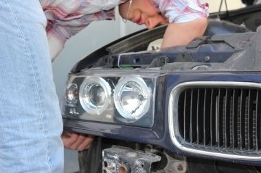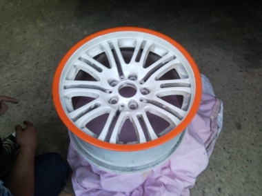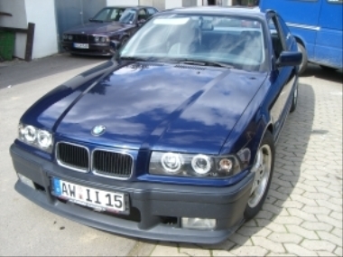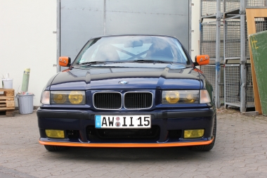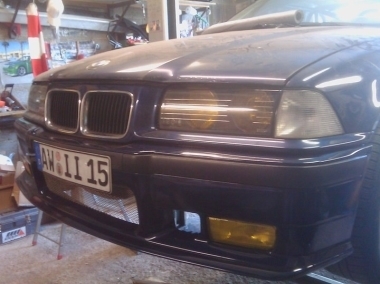Beim Kauf waren mir die nicht passenden Angle Eyes, sowie die Nebelscheinwerfer aufgefallen, die ich durch gelbe M3 GT Scheinwerfer ausgetauscht habe. Wie man auf dem Bild erkennen kann, habe ich auch die Frontstoßstange wieder dran montiert und mit Orangener Folie beklebt.