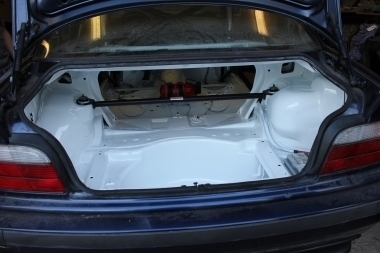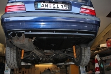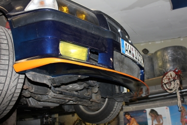 Als ich endlich mit dem Unterboden fertig war, habe ich dem Ganzen mit Unterbodenschutz einen neuen Anstrich verliehen. Danach habe ich den originalen Heckdiffusor gegen einen M3 Diffusor getauscht.