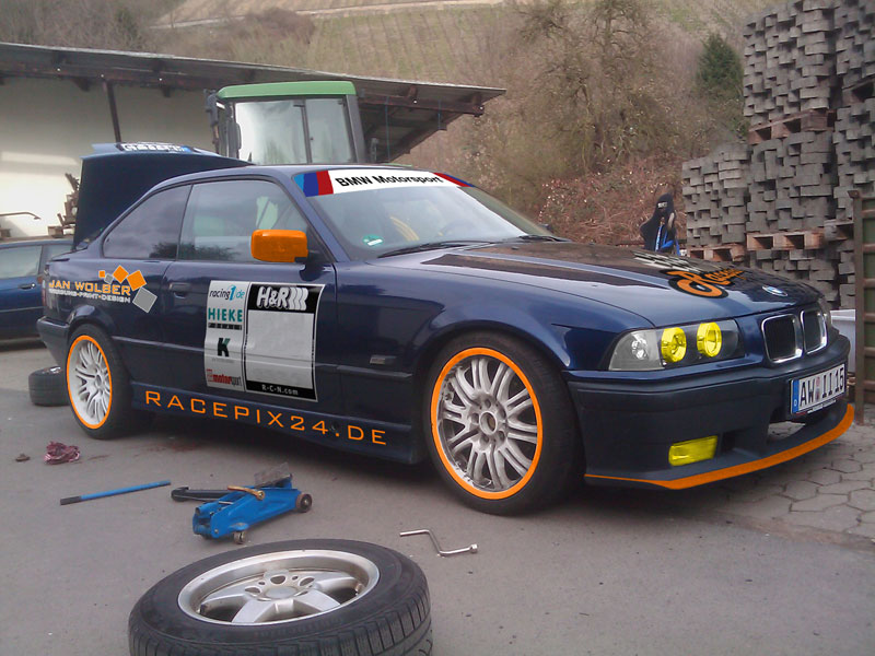 Durch meinen neu gefundenen Sponsor, hat das Auto mittlerweile eine schöne motorsportliche Farbe bekommen. Alle meine Freunde haben sich auf der Stoßstange verewigt. Jetzt wurde es auch Zeit für die Aufkleber der Sponsoren und Beteiligten. Das neue KW Variante 3 (mit NOS Abstimmung) Fahrwerk bekam seine neue Rennsporteinstellung.