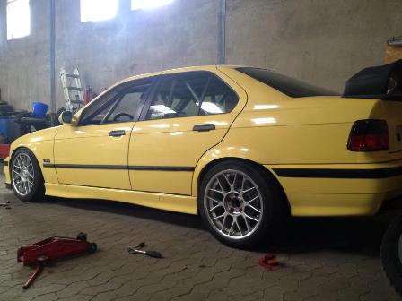 Vorne wurde die große Bremse vom E36 M3 verbaut. Dazu braucht man nur die passenden Sattelhalter, die man sich bauen lassen kann, oder der ganze Achsschenkel muss gegen den des M3 getauscht werden. Jetzt können nur Felgen ab 16 Zoll aufwärts gefahren werden, da die Bremse so groß ist. Passend bekam der Rennwagen 17 Zoll BBS, wobei wir die Kotflügelkanten noch umlegen und ziehen mussten.