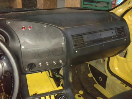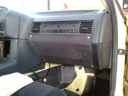 Das Armaturenbrett wurde in der Mittelkonsole für die späteren Schalter und Anzeigeinstrumente vorbereit. Dazu haben wir die obere Belüftung entfernt und uns eine passende Schablone aus Plastik gebaut. Dies bekommt man in jedem Baumarkt zu kaufen. Damit das Ganze optisch etwas abgerundet wird, haben wir einige Teile des Innenraums mit Alcantara-Leder überzogen.