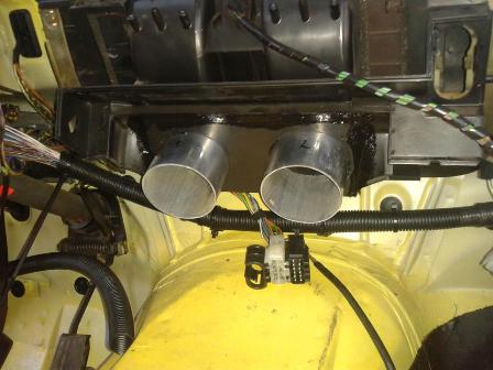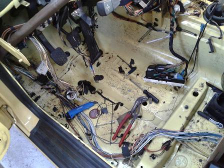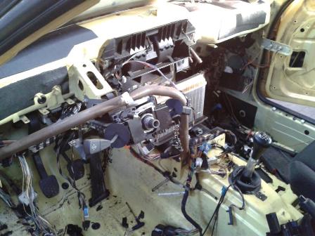 Da wir keine halben Sachen machen, musste das Armaturenbrett vorerst weichen. Auch hier versteckten sich Teermatten, die entfernt wurden. Um noch einige Kilos zu sparen, wurde die komplette Heizung entfernt, die gute 10 Kilo wiegt. Das Gebläse durfte an Ort und Stelle bleiben und wurde mit zwei Rohren modifiziert, damit die Scheibenbelüftung in Funktion bleibt. Dies ist eine Pflichtbestimmung im Rennsport, wenn keine Frontscheibenheizung existiert.