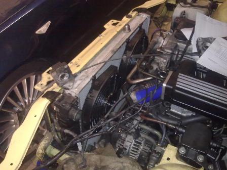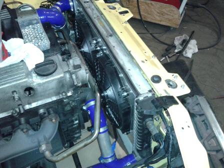 Auch das Herz eines Rennwagens braucht Pflege und Zuwendung, darum bauten wir die komplette vordere Front ab. Auch wenn ein Diesel lange nicht so heiß wird wie ein Benziner, braucht er Kühlung, darum entschieden wir uns für einen großen Klimakühler. Da der Viskolüfter dem Motor Energie klaut, entfernten wir Ihr und bauten 2 E-Lüfter auf den Kühler. Eine angepasste Aluplatte bringt die Lüfter an ihren richtigen Ort und gibt ihnen Halt. Um den Motor bei erhöhtem Ladedruck standfest zu machen, wurden einige Schläuche und Schellen erneuert. Dazu bekam der Diesel auch einen größeren Ladeluftkühler, der vor dem Wasserkühler angebracht wurde.